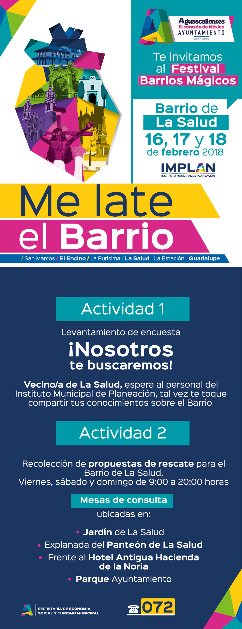 Como parte del programa Barrios Mágicos, que promueve la actual administración municipal, este 16, 17 y 18 de febrero se desarrollará la consulta ciudadana en el Barrio de la Salud; en este evento residentes y ciudadanos en general podrán expresar su opinión respecto de los cambios que a su parecer se requieran en el lugar, para ejecutarlos en el plan de realce y embellecimiento contemplado.