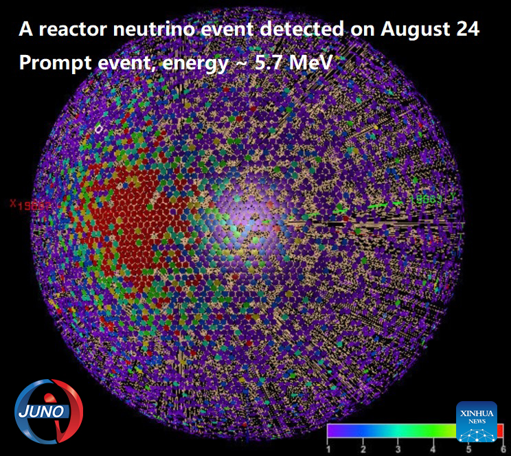 BEIJING, 26 agosto, 2025 (Xinhua) — Imagen del 24 de agosto de 2025 de un diagrama esquemático de un evento de neutrinos de reactor detectado por el Observatorio Subterráneo de Neutrinos de Jiangmen (JUNO), en Jiangmen, en la provincia de Guangdong, en el sur de China. El detector esférico transparente más grande del mundo comenzó a operar el martes en China, convirtiéndose en la primera instalación científica ultragrande del mundo en funcionamiento dedicada a la investigación de neutrinos con precisión ultraalta. Tras completar el llenado de su detector de centelleo líquido de 20.000 toneladas, JUNO, en Guangdong, comenzó a recopilar datos tras más de una década de preparación y construcción. (Xinhua)