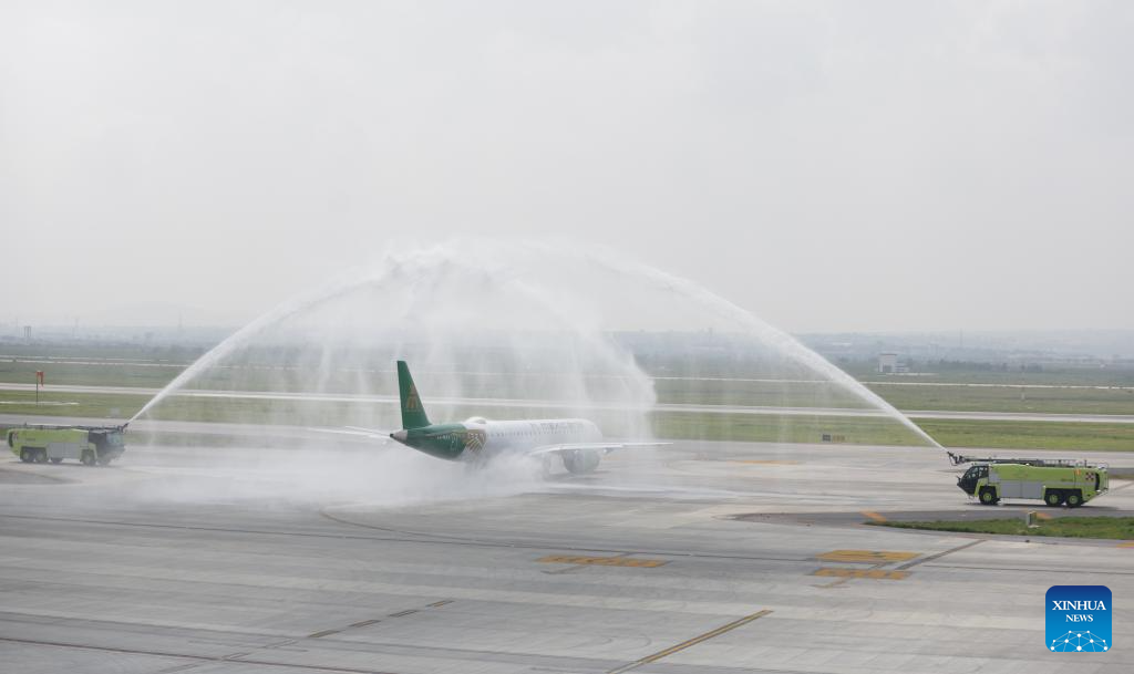 ZUMPANGO, 25 agosto, 2025 (Xinhua) — Imagen del 25 de agosto de 2025 de la aeronave EMBRAER E-195 de la Aerolínea del Estado Mexicano “Mexicana” recibiendo un saludo de agua previo a su primer vuelo en el Aeropuerto Internacional Felipe Angeles, en Zumpango, México. (Xinhua/Francisco Cañedo)