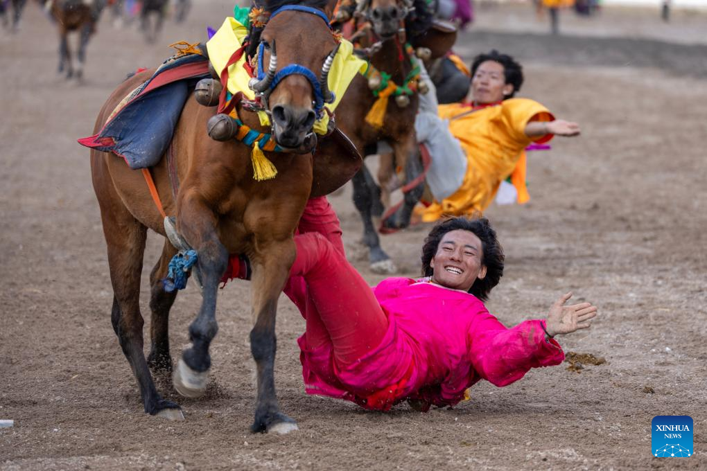NAGQU, 5 septiembre, 2025 (Xinhua) — Jinetes muestran sus habilidades ecuestres durante la edición 2025 de un festival tradicional de carreras de caballos, en Nagqu, en la región autónoma de Xizang, en el suroeste de China, el 5 de septiembre de 2025. El festival de tres días de duración, un evento tradicional del norte de la meseta tibetana, comenzó el viernes en Nagqu. El festival incluye competencias deportivas, presentaciones artísticas y actividades de turismo cultural, atrayendo a una gran cantidad de residentes y visitantes. (Xinhua/Jiang Fan)