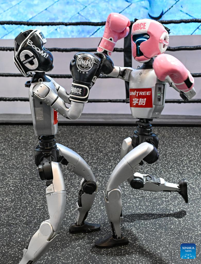 CHONGQING, 4 septiembre, 2025 (Xinhua) — Un juego de boxeo de robots es visto en el estand de Unitree, en la sede de la Exposición Mundial de la Industria Inteligente 2025, en Chongqing, en el suroeste de China, el 4 de septiembre de 2025. La exposición está programada del 5 al 8 de septiembre en Chongqing para presentar los logros de vanguardia de la industria inteligente mediante exposiciones profesionales. (Xinhua/Wang Quanchao)