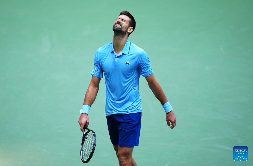 NUEVA YORK, 6 septiembre, 2025 (Xinhua) — Imagen del 5 de septiembre de 2025 de Novak Djokovic, de Serbia, reaccionando durante el partido de semifinal de individuales masculinos ante Carlos Alcaraz, de España, en el campeonato de tenis US Open 2025, en Nueva York, Estados Unidos. (Xinhua/Wu Xiaoling)