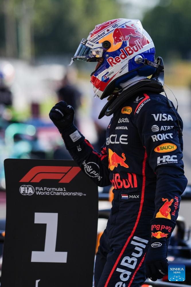 MONZA, 7 septiembre, 2025 (Xinhua) — Imagen del 6 de septiembre de 2025 del ganador de la pole position, el piloto neerlandés de la escudería Red Bull, Max Verstappen, festejando al término de la sesión de clasificación del Gran Premio de Italia de Fórmula 1, en el Circuito de Monza, cerca de Milán, Italia. (Xinhua/Peng Ziyang)