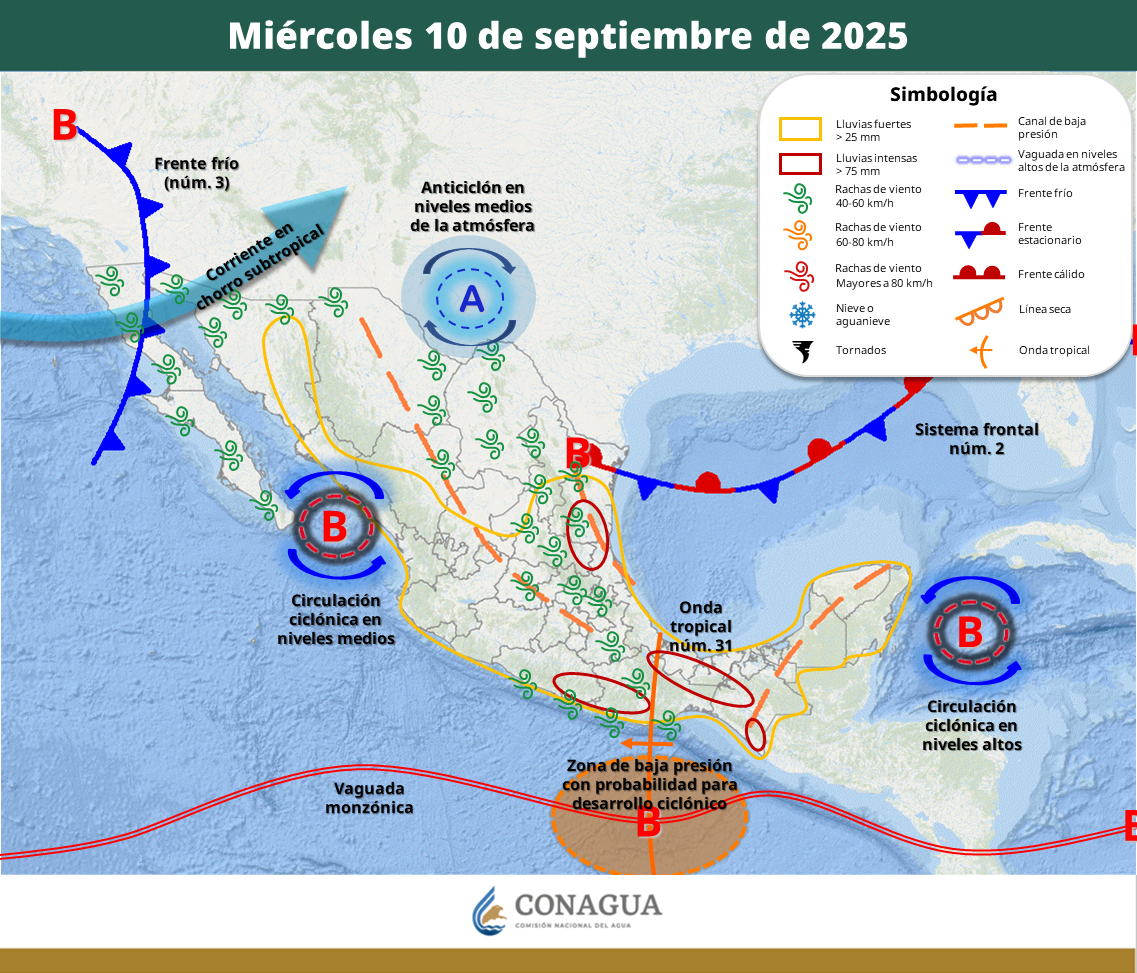 Pronóstico a 48 horas de Sistemas Meteorológicos. Período de validez de las 08:00 horas del miércoles 10 a las 08:00 horas del jueves 11 de septiembre de 2025