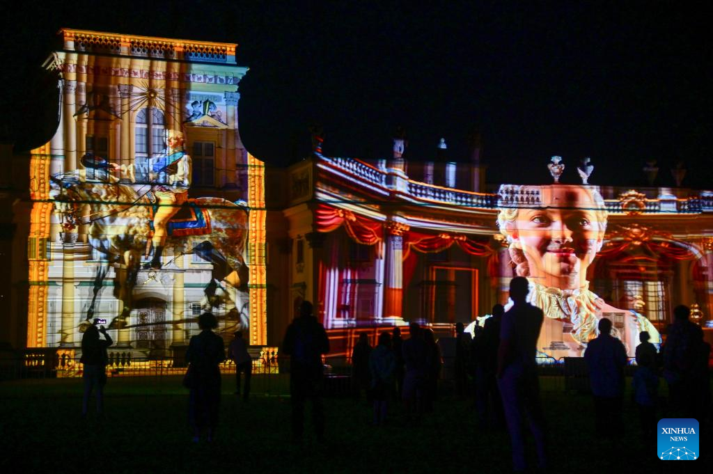 VARSOVIA, 13 septiembre, 2025 (Xinhua) — Imagen del 12 de septiembre de 2025 de personas observando el espectáculo de mapeo “Colección Real de Pinturas Vivas” impulsado por inteligencia artificial, en el Museo del Palacio del Rey Juan III, en Wilanów, Varsovia, Polonia. (Xinhua/Aleksy Witwicki)