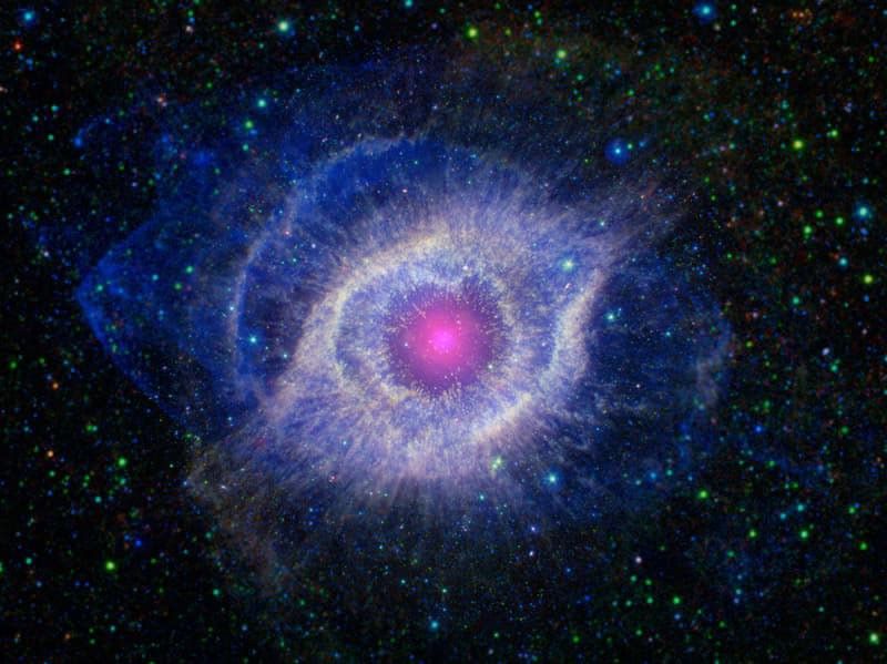 La nebulosa de la Hélice, fotografiada aquí, se encuentra a 650 años luz de distancia, en la constelación de Acuario. También conocida como NGC 7293, es un ejemplo típico de nebulosa planetaria. NASA/JPL-Caltech.