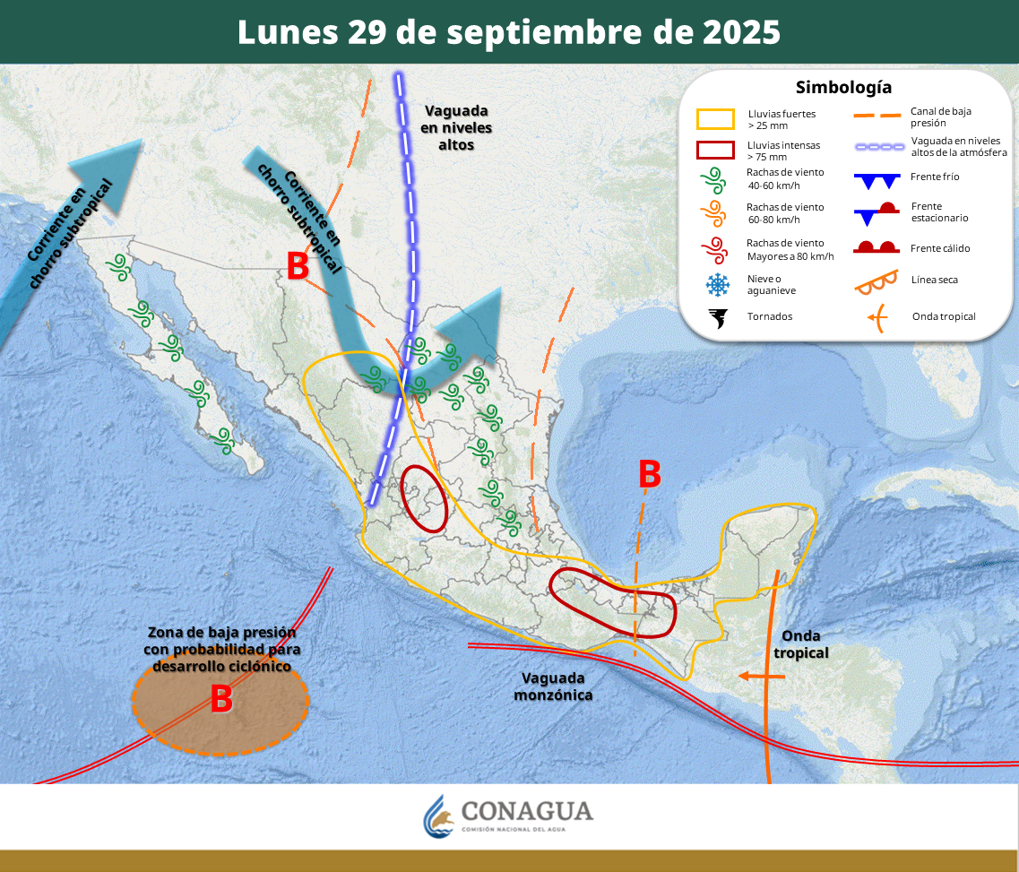 La onda tropical se desplazará lentamente sobre el sureste y sur del territorio nacional, asociada con una zona de baja presión con probabilidad de desarrollo ciclónico al sur de las costas de Oaxaca y Guerrero; ambos sistemas interaccionarán con un sistema de baja presión en el golfo de golfo de México y con la vaguada monzónica que se extenderá muy próxima a las costas del Pacífico Sur Mexicano, ocasionando lluvias fuertes a puntuales intensas en las mencionadas regiones, incluida la península de Yucatán, así como en el oriente, centro y occidente del país.