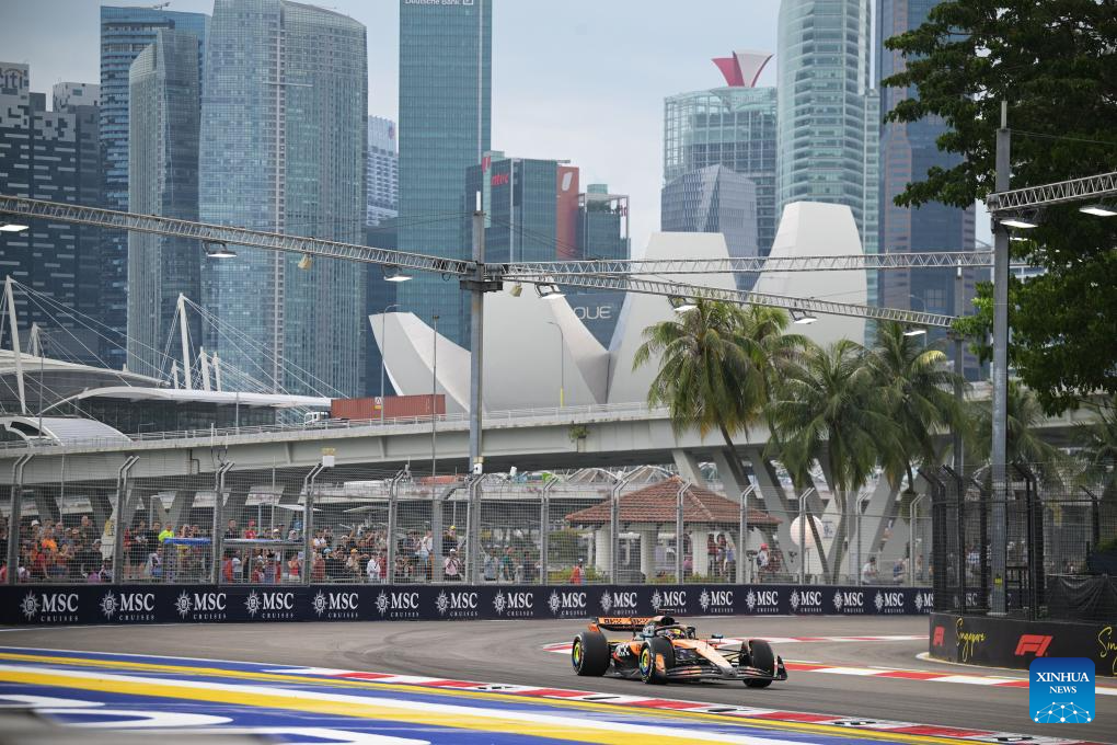SINGAPUR, 3 octubre, 2025 (Xinhua) — El piloto australiano de la escudería McLaren, Oscar Piastri, compite durante la primera sesión de práctica del Gran Premio de Singapur 2025 de Fórmula 1, en Singapur, el 3 de octubre de 2025. (Xinhua/Then Chih Wey)