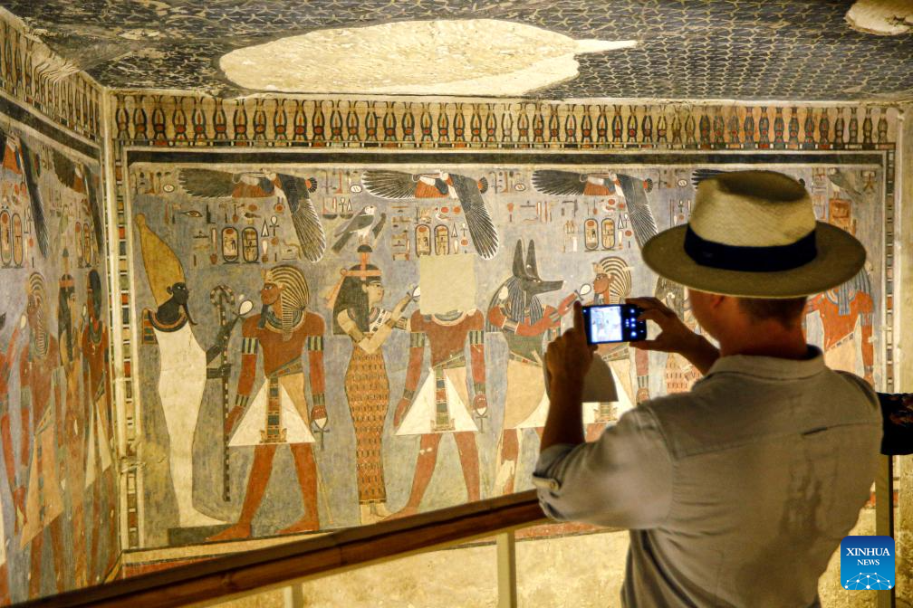 LUXOR, 4 octubre, 2025 (Xinhua) — Un turista toma fotografías mientras visita la tumba del faraón Amenhotep III del Imperio Nuevo, en el Valle de los Reyes, en la ribera occidental de Luxor, Egipto, el 4 de octubre de 2025. El Ministerio de Turismo y Antigüedades de Egipto abrió el sábado al público la tumba del faraón Amenhotep III del Imperio Nuevo en el Valle de los Reyes, después de más de dos décadas de restauración. (Xinhua/Ahmed Gomaa)