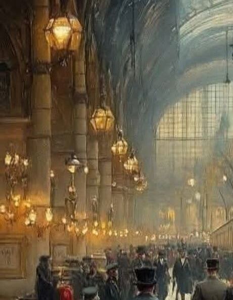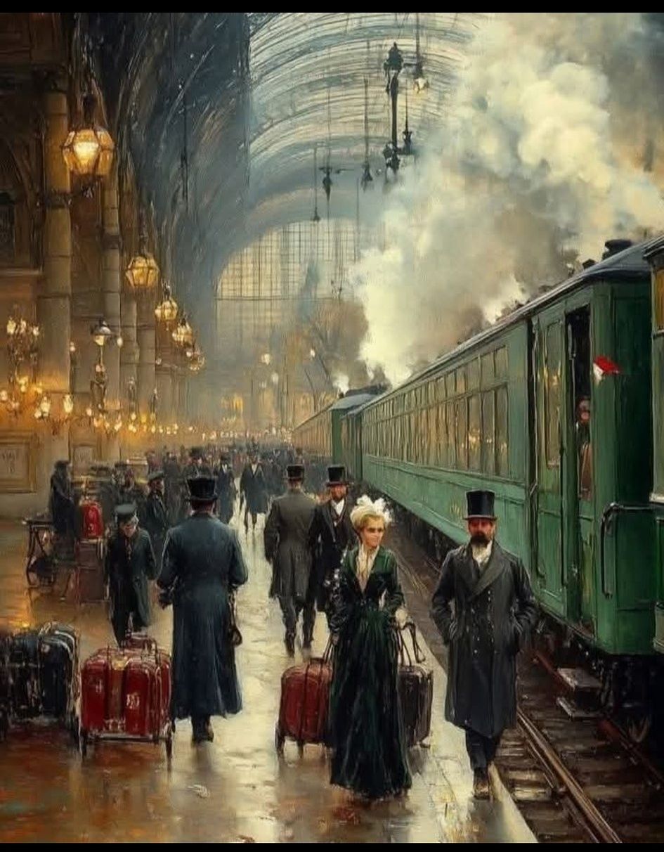 La imagen —un andén cubierto de vapor, hombres con sombrero de copa, mujeres elegantes arrastrando maletas— no es sólo una escena de tránsito: es una metáfora del cambio, del movimiento perpetuo que el mundo moderno impuso al alma humana.