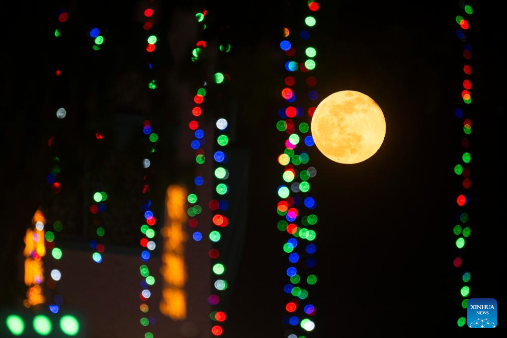 SINGAPUR, 7 octubre, 2025 (Xinhua) — La luna llena se eleva sobre el cielo, en Singapur, el 7 de octubre de 2025. (Xinhua/Then Chih Wey)