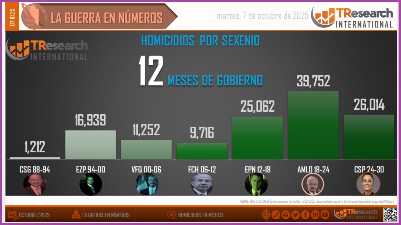 Ayer mismo en estos espacios se hacía ver cómo la reducción en los homicidios que tanto celebró Claudia Sheinbaum sólo es real, demostrable, cuando se compara a su gobierno con el de Andrés Manuel López Obrador, no así cuando se le compara con los de Enrique Peña Nieto o Felipe Calderón Hinojosa, como se puede ver en la gráfica que aparece después de este párrafo, elaborada a partir de los datos oficiales por TResearch International de México.