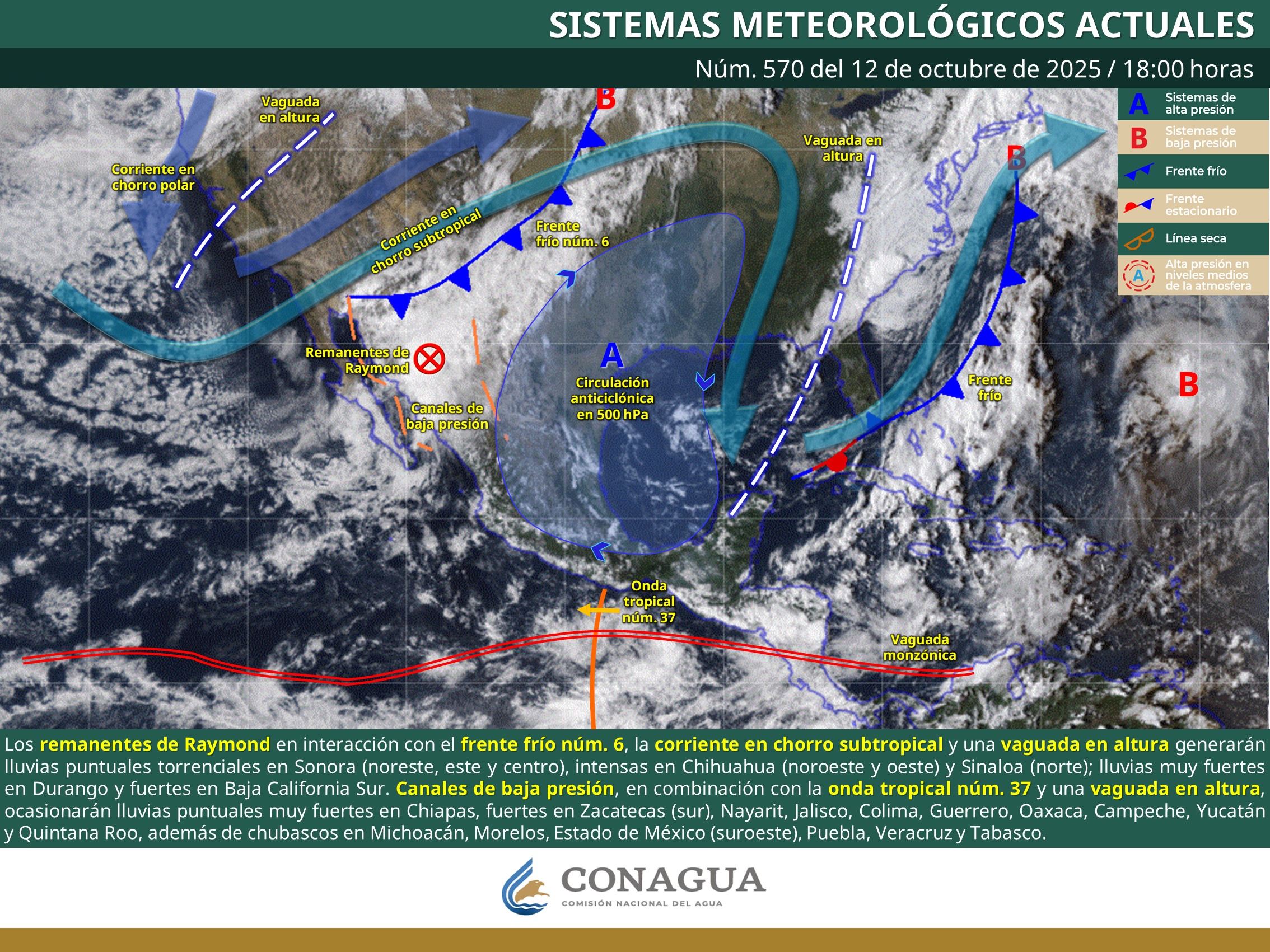 Durante esta noche y madrugada del lunes, los remanentes de Raymond en interacción con el frente frío núm. 6, asociado con la corriente en chorro subtropical y una vaguada en altura generarán lluvias puntuales torrenciales en Sonora (noreste, este y centro), intensas en Chihuahua (noroeste y oeste) y Sinaloa (norte); lluvias muy fuertes en Durango y fuertes en Baja California Sur. Asimismo, se pronostican vientos de 30 a 40 km/h con rachas de 50 a 70 km/h en el golfo de California, así como en costas Sonora y Sinaloa. Canales de baja presión sobre el occidente, centro, sur y sureste del país, aunados a la onda tropical núm. 37 al sur de Oaxaca y una vaguada en altura sobre la península de Yucatán, ocasionarán lluvias puntuales muy fuertes en Chiapas, fuertes en Zacatecas (sur), Nayarit, Jalisco, Colima, Guerrero, Oaxaca, Campeche, Yucatán y Quintana Roo, además de chubascos en Michoacán, Morelos, Estado de México (suroeste), Puebla, Veracruz y Tabasco. Al final del periodo de pronóstico, el frente frío núm. 6 se desplazará hacia el suroeste de Estados Unidos.