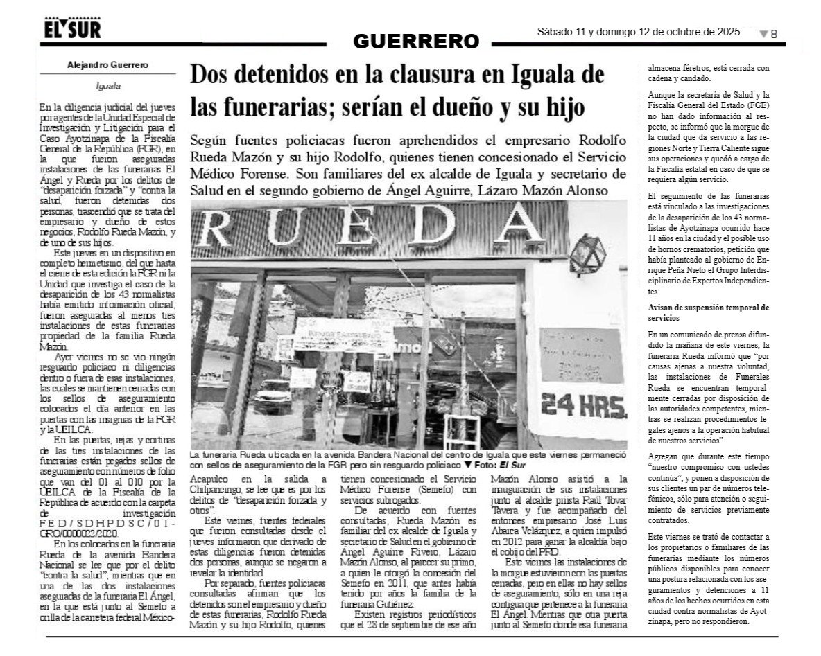Según la nota de El Sur, el aseguramiento derivó en la detención del empresario Rodolfo Rueda Mazón y su hijo, concesionarios del Servicio Médico Forense local desde septiembre de 2014, y allegados al exalcalde de Iguala José Luis Abarca y al exsecretario de Salud Lázaro Mazón Alonso. La versión oficial de la FGR apunta a una investigación por “desaparición forzada” y a la búsqueda de indicios relacionados con los hechos de 2014.