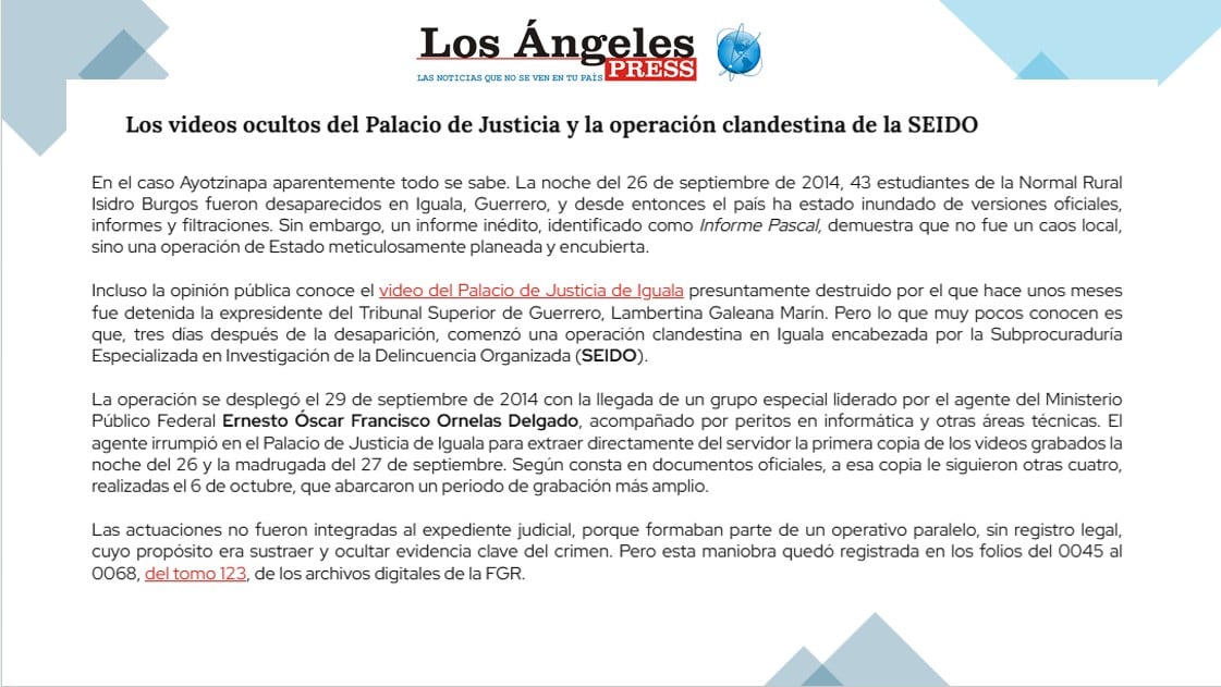 El analista, de quien se reserva el nombre por razones de seguridad, también cuestiona el papel de los agentes del Ministerio Público Federal que intervinieron en 2014, en particular el de Ernesto Óscar Francisco Ornelas Delgado, a quien identifica como pieza central en la manipulación del expediente de Iguala.