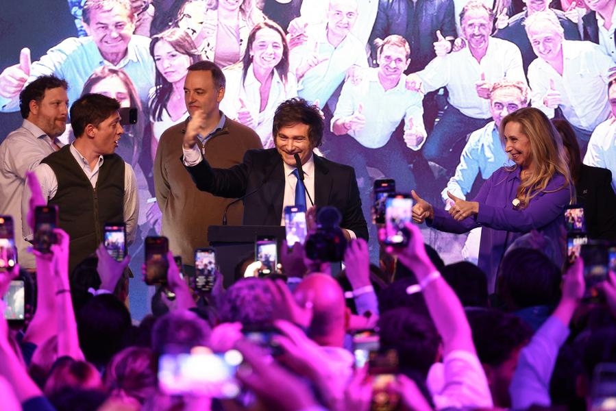 (251027) — BUENOS AIRES, 27 octubre, 2025 (Xinhua) — Imagen del 26 de octubre de 2025 del presidente argentino, Javier Milei (c), reaccionando en el búnker del partido La Libertad Avanza (LLA) al finalizar las elecciones legislativas de medio término, en la ciudad de Buenos Aires, capital de Argentina. Milei celebró el domingo el triunfo de su partido, LLA, en las elecciones legislativas de medio término, y prometió el desarrollo de un “camino reformista para consolidar el crecimiento y el despegue definitivo” del país sudamericano. (Xinhua/Str)