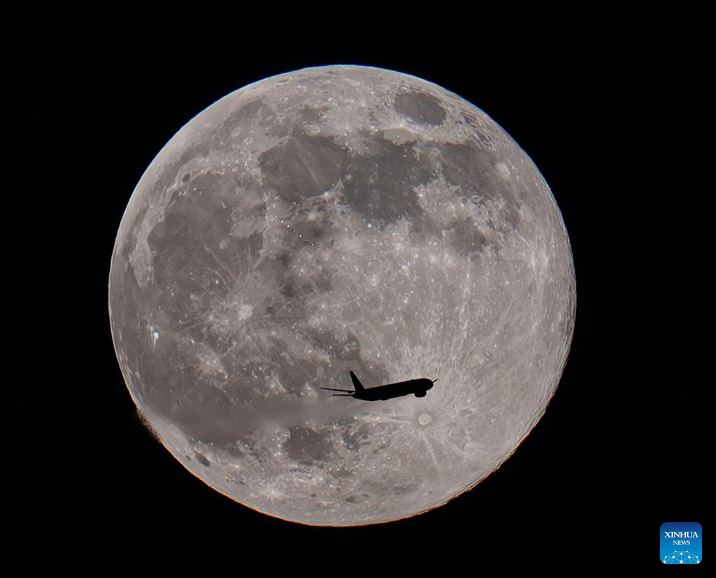 CIUDAD DE KUWAIT, 5 noviembre, 2025 (Xinhua) — La luna llena es vista con un avión sobrevolando la Ciudad de Kuwait, Kuwait, el 5 de noviembre de 2025. (Xinhua/Asad)