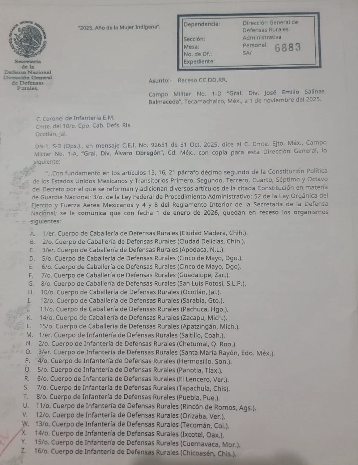 Un documento interno de la Secretaría de la Defensa Nacional (SEDENA) fechado el 1 de noviembre de 2025, firmado desde el Campo Militar No. 1-D “Gral. Div. José Emilio Salinas Balmaceda”, ordena que a partir del 1 de enero de 2026 quedarán “en receso” 26 Cuerpos de Caballería e Infantería de las Defensas Rurales distribuidos en 21 estados del país.