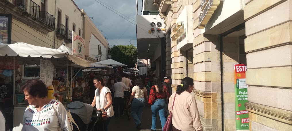 Aguascalientes, Ags.– El centro histórico de Aguascalientes luce completamente rebasado por la afluencia de personas debido a la temporada navideña. Calles estrechas, pasillos comerciales y zonas peatonales se encuentran saturadas desde el mediodía.