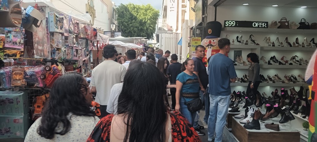 Como se observa en la imagen, el flujo de peatones es constante y en algunos puntos prácticamente inmóvil, lo que ha complicado el tránsito peatonal y el acceso a comercios. Familias enteras, vendedores ambulantes y compradores se concentran en un espacio reducido sin control visible de aforos.