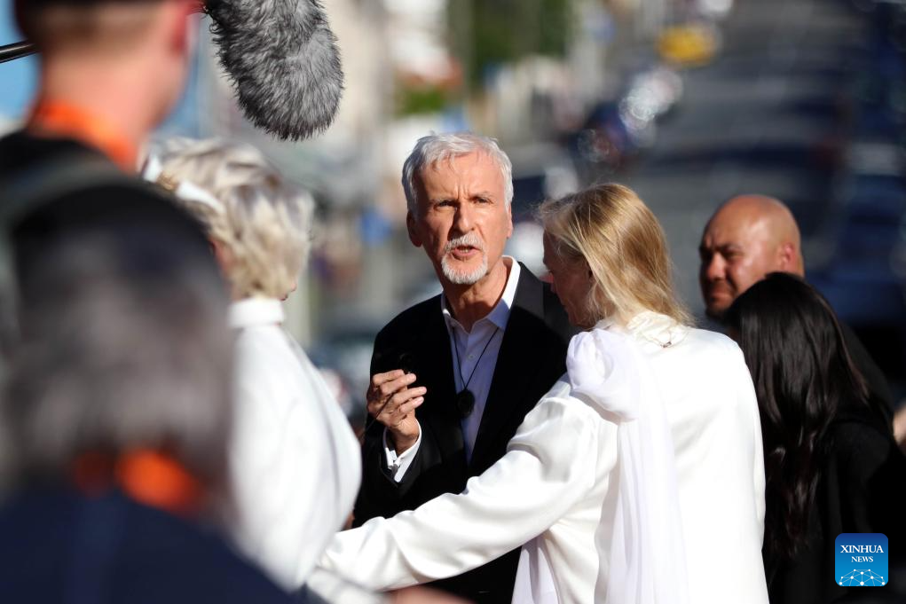 WELLINGTON, 14 diciembre, 2025 (Xinhua) — Imagen del 13 de diciembre de 2025 de James Cameron (c), director de la película “Avatar: Fuego y cenizas”, asistiendo al estreno de la película, en Wellington, Nueva Zelanda. El estreno se llevó a cabo el sábado, con la participación del director James Cameron y el elenco de la película. (Xinhua/Meng Tao)