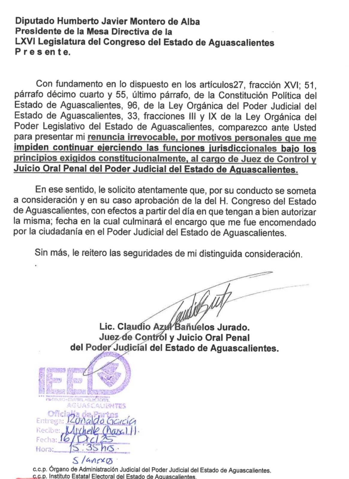 En el escrito presentado ante el Congreso del Estado, el ahora exjuez afirma que motivos personales le impiden continuar ejerciendo funciones jurisdiccionales bajo los principios exigidos constitucionalmente, una expresión inusual que ha generado inquietud entre abogados y operadores del sistema penal.