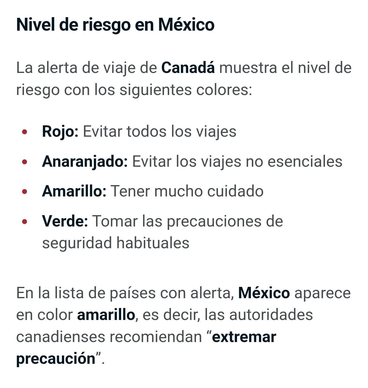 De acuerdo con la actualización más reciente del sistema de travel advice del gobierno canadiense, México aparece en color amarillo a nivel nacional, lo que implica una recomendación oficial de “extremar precauciones”. Sin embargo, el desglose por entidades federativas revela un escenario mucho más grave.