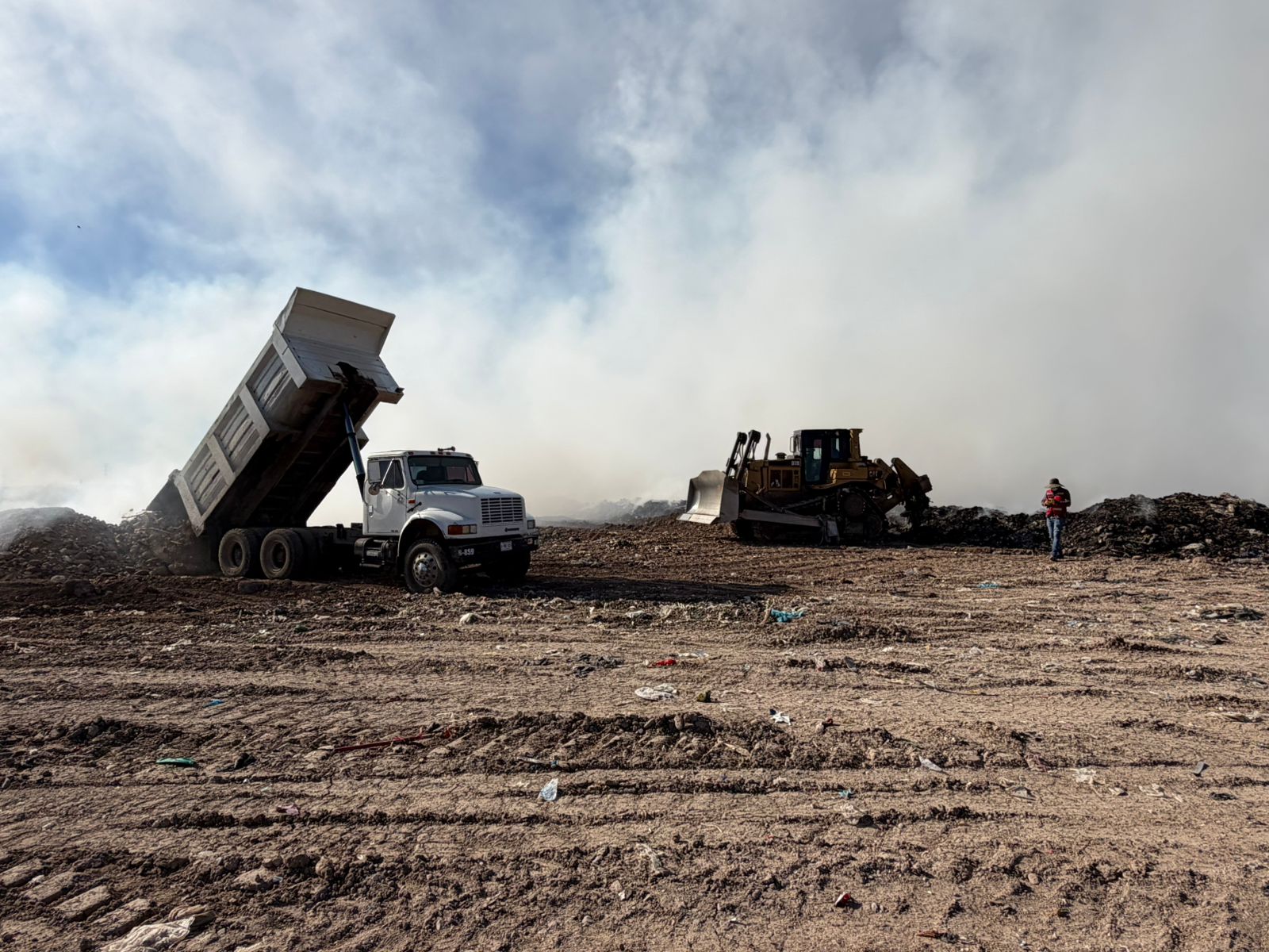 Ríodoce.- Personal de Bomberos, en coordinación con la Secretaría de Obras Públicas del Estado y el Ayuntamiento de Culiacán, mantienen los trabajos para sofocar en su totalidad el incendio en el relleno sanitario durante este domingo.