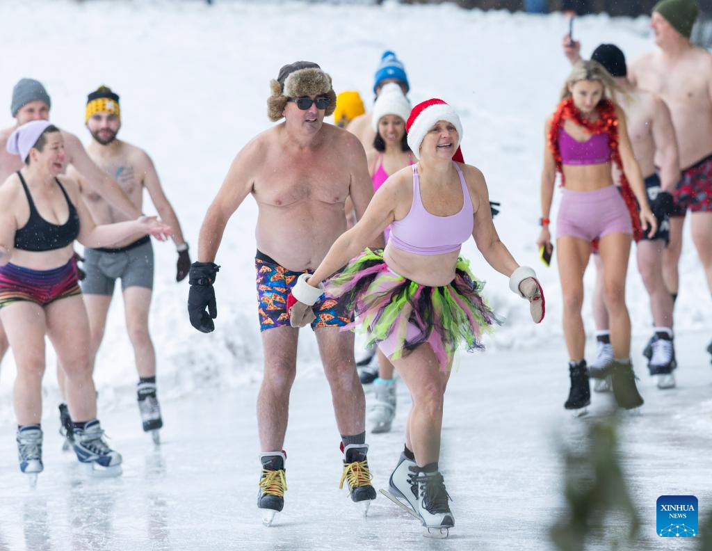 TORONTO, 29 diciembre, 2025 (Xinhua) — Imagen del 28 de diciembre de 2025 de personas portando traje de baño mientras participan en el evento Patinaje del Oso Polar de Toronto 2025, en Toronto, Canadá. Alrededor de 160 patinadores participaron el domingo en este evento anual para despedir el año 2025. (Xinhua/Zou Zheng)
