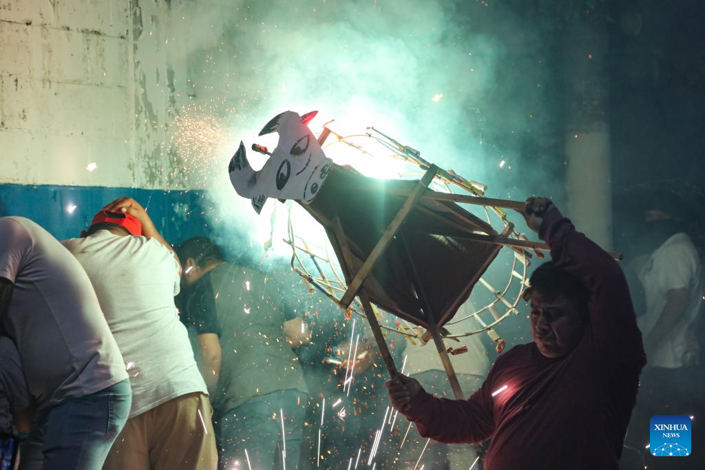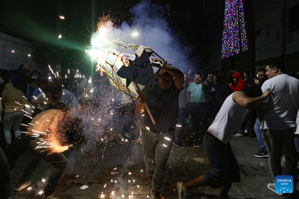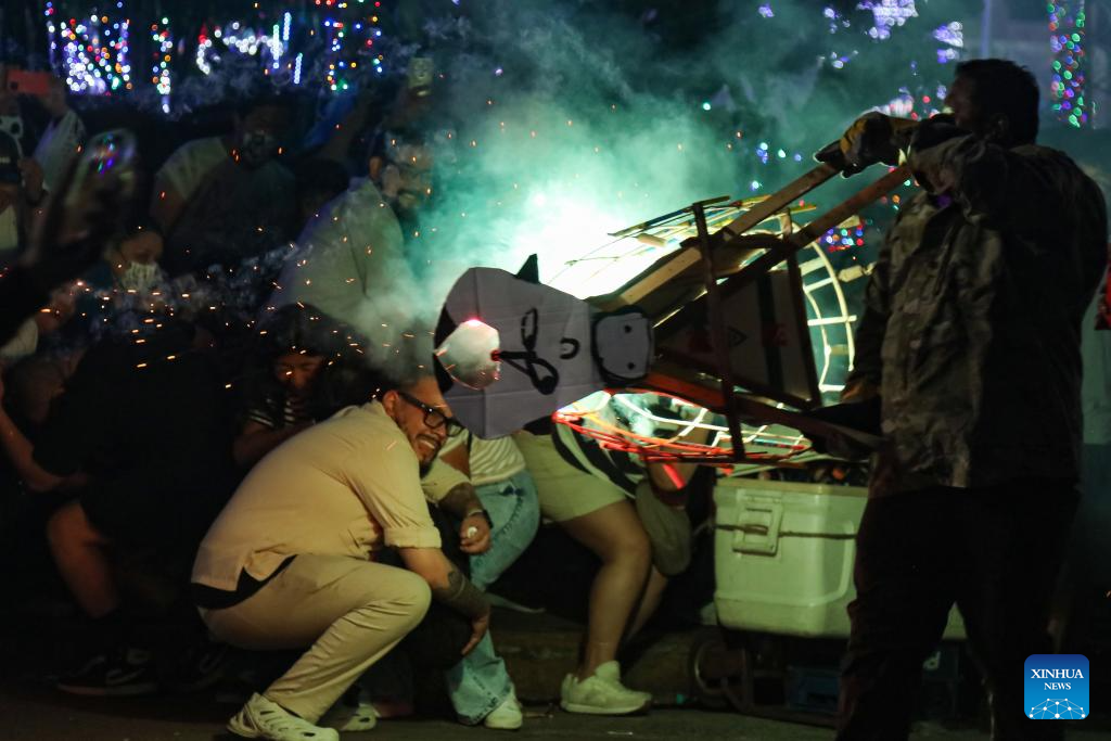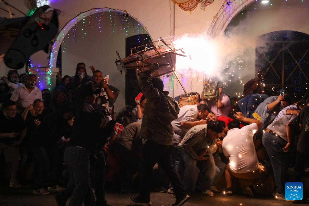 LA LIBRTAD, 29 diciembre, 2025 (Xinhua) — Imagen del 28 de diciembre de 2025 de un hombre participando en la carrera del “Torito Pinto” durante el cierre de las fiestas de Antiguo Cuscatlán, en el departamento de La Libertad, El Salvador. (Xinhua/Alexander Peña)