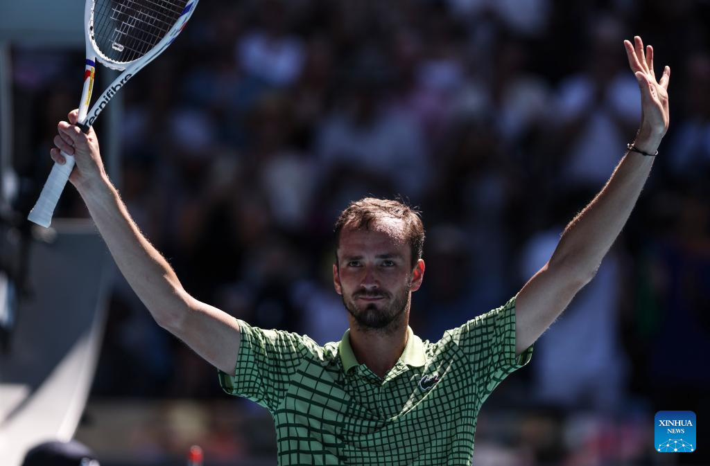 MELBOURNE, 23 enero, 2026 (Xinhua) — Daniil Medvedev, de Rusia, festeja después de ganar el partido de tercera ronda de individuales masculinos ante Fabian Marozsan, de Hungría, en el torneo de tenis Abierto de Australia, en Melbourne, Australia, el 23 de enero de 2026. (Xinhua/Ma Ping)