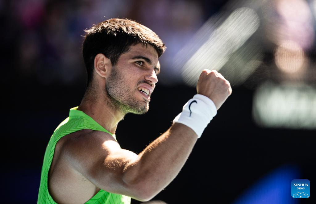 MELBOURNE, 23 enero, 2026 (Xinhua) — Carlos Alcaraz, de España, festeja después de ganar el partido de tercera ronda de individuales masculinos ante Corentin Moutet, de Francia, en el torneo de tenis Abierto de Australia, en Melbourne, Australia, el 23 de enero de 2026. (Xinhua/Hu Jingchen)