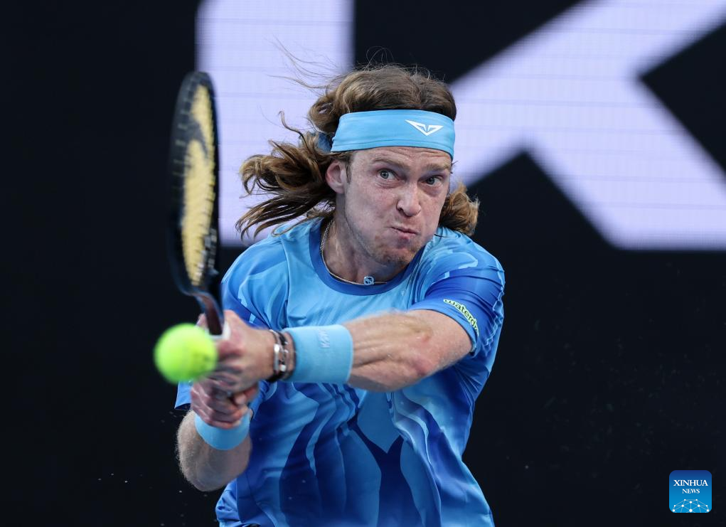 MELBOURNE, 23 enero, 2026 (Xinhua) — Andrey Rublev devuelve la pelota durante el partido de tercera ronda de individuales masculinos entre Andrey Rublev, de Rusia, y Francisco Cerúndolo, de Argentina, en el torneo de tenis Abierto de Australia, en Melbourne, Australia, el 23 de enero de 2026. (Xinhua/Ma Ping)