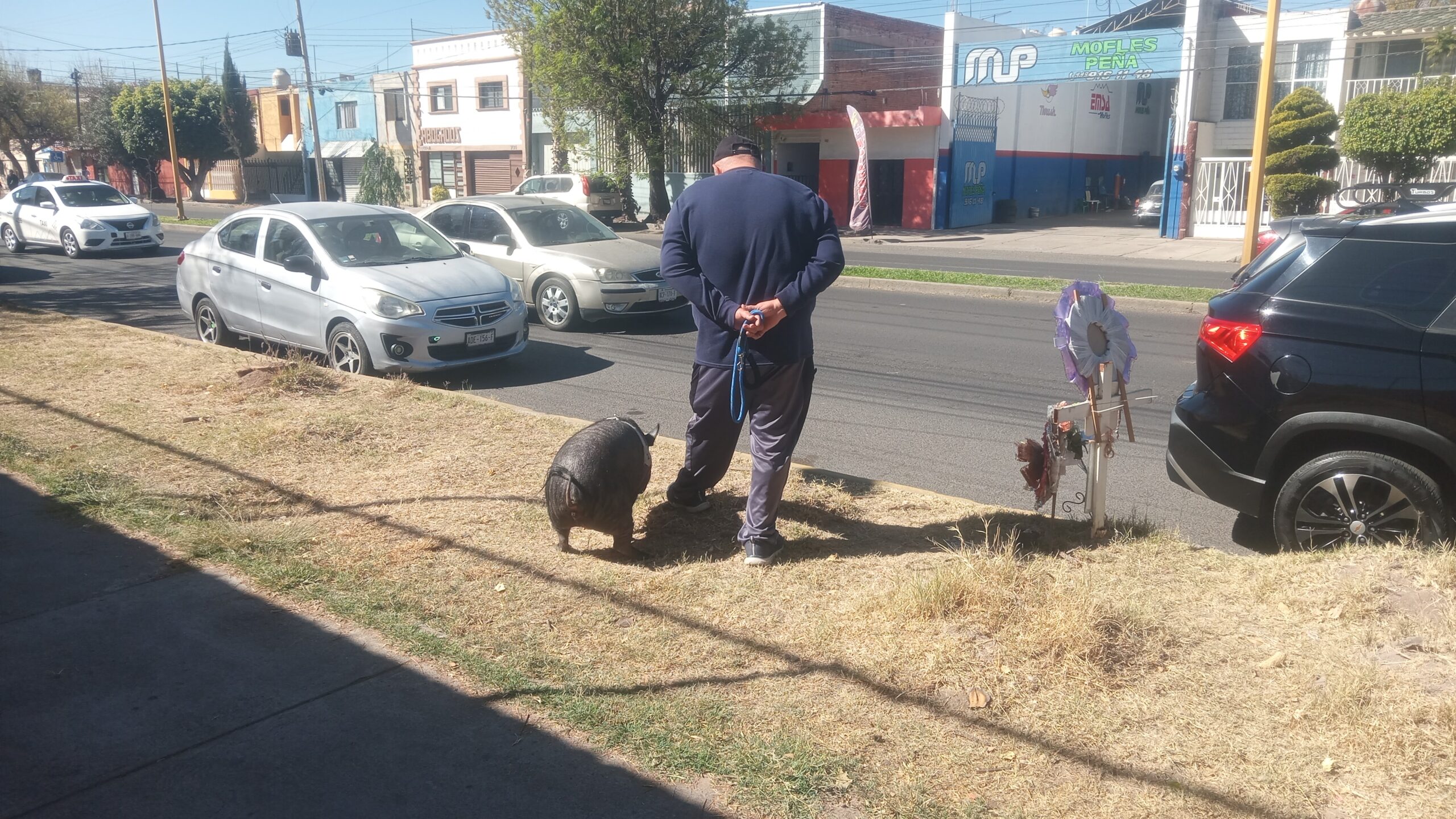 Un hombre camina tranquilamente por una avenida de Aguascalientes acompañado de su mascota, un puerco, sorprendiendo a quienes pasan por el lugar. Foto/Cuauhtémoc Villegas Durán/Objetivo7fotógrafos