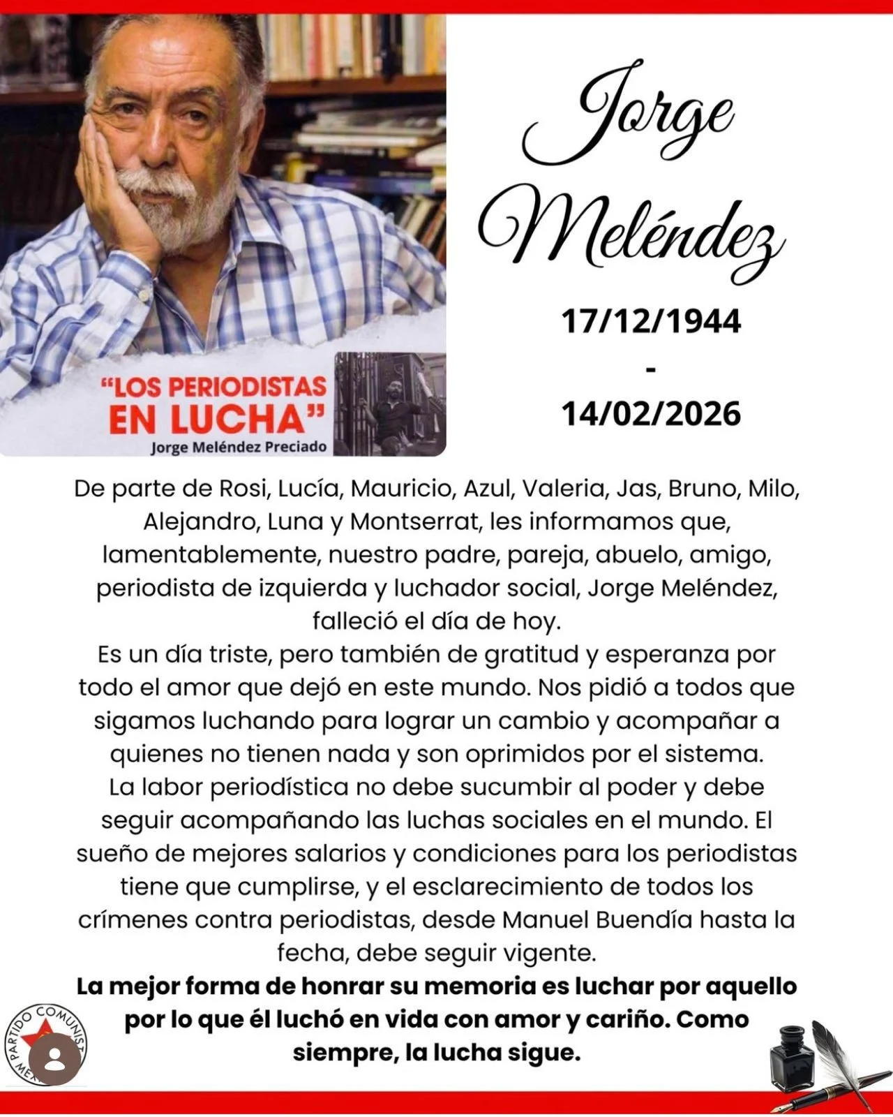 El periodista mexicano Jorge Meléndez falleció este viernes a los 81 años, informó su familia a través de un comunicado público. Reconocido por una trayectoria marcada por el periodismo crítico, de izquierda y comprometido con las luchas sociales, Meléndez murió rodeado de sus seres queridos.