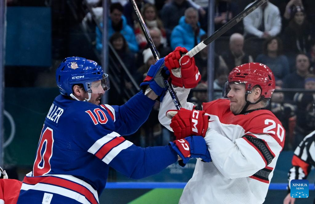 MILAN, 15 febrero, 2026 (Xinhua) — Imagen del 14 de febrero de 2026 de JT Miller (i), de Estados Unidos, y Lars Eller, de Dinamarca, enfrentándose durante el partido del grupo C de la ronda preliminar masculina entre Estados Unidos y Dinamarca de hockey sobre hielo en los Juegos Olímpicos de Invierno Milán-Cortina 2026, en Milán, Italia. Foto/Xinhua/Zhang Haofu