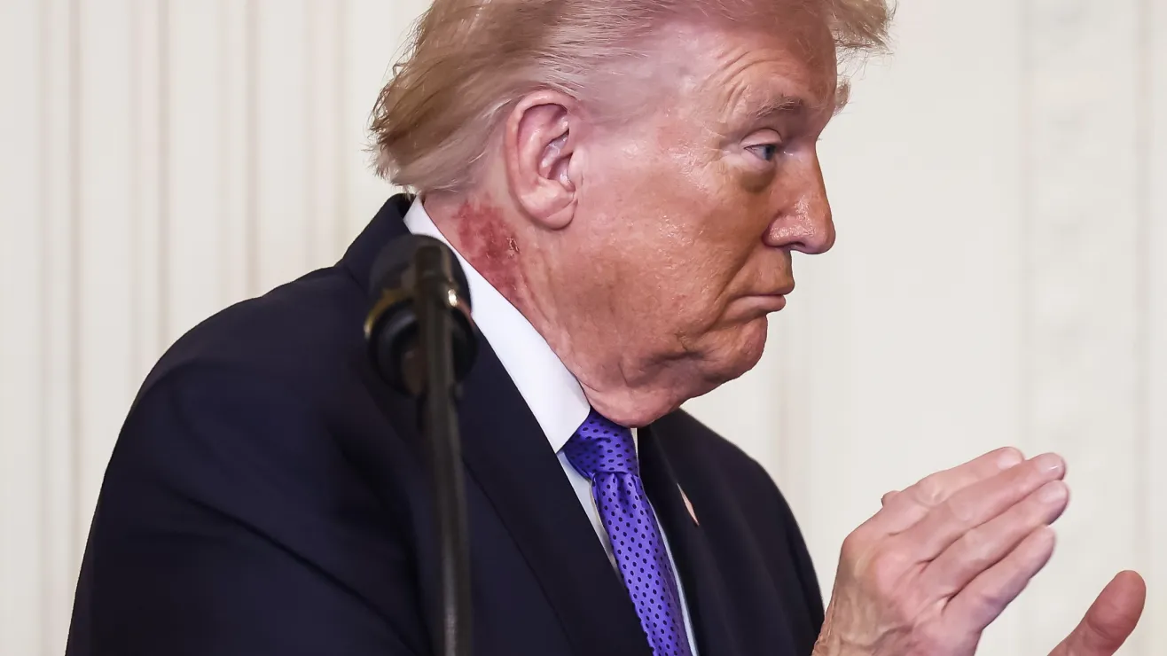 WASHINGTON D.C. – Una fotografía capturada por la agencia Agence France-Presse (AFP) durante una ceremonia en la Casa Blanca este lunes, ha desatado una ola de especulaciones globales sobre el estado de salud del presidente Donald Trump. En la imagen, se observa una notable mancha rojiza en el costado derecho de su cuello, lo que llevó a teorías que iban desde hematomas hasta enfermedades graves.