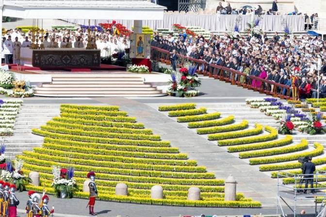 Cientos de fieles en la Plaza de San Pedro en la Misa del Domingo de Pascua. Crédito: Daniel Ibañez/ EWTN News