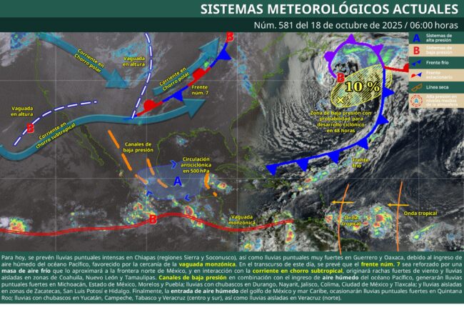 Por Cuauhtémoc Villegas Durán / Data2Ciudad de México, 18 de octubre de 2025. El Servicio Meteorológico Nacional (SMN) advirtió este sábado sobre lluvias muy fuertes e intensas en el sur y sureste del país, principalmente en Chiapas, Oaxaca y Guerrero, donde el ingreso de aire […]