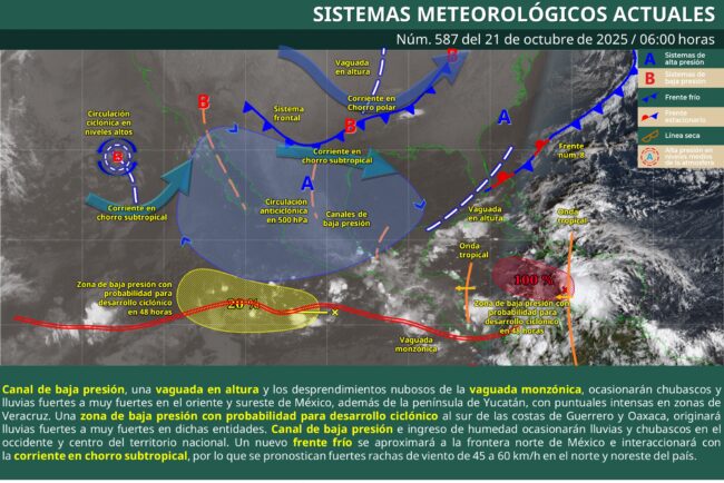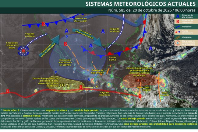 Ciudad de México, 20 de octubre de 2025. — El Servicio Meteorológico Nacional informó que el frente frío número 8, estacionado sobre el oriente del Golfo de México, mantendrá condiciones de lluvias muy fuertes a intensas en el sureste del país, principalmente en Veracruz y […]